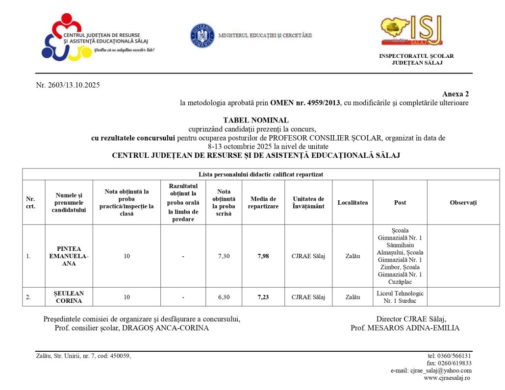 Repartizarea candidaților pe posturile scoase la concurs – CONSILIERE PSIHOPEDAGOGICĂ:
