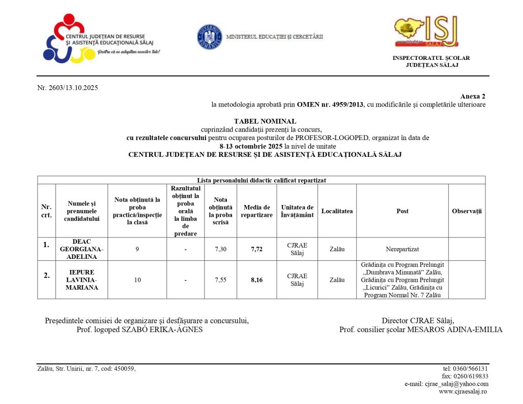Rezultate finale după probă scrisă, la disciplina de examen aferentă postului, din data de 13.10.2025.